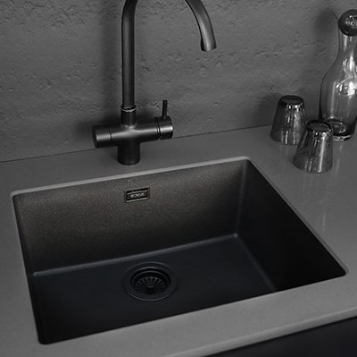 Myymme kivikomposiittialtaita, koska ne sopivat erityisen hyvin yhdistettäväksi kivitasojen kanssa. Musta allas sopii hyvin yhteen minkä tahansa kivitason kanssa, tuoden selkeää kontrastia vaaleiden kvartsien kuten Carrara Icen ja Pure White kanssa tai sulautuen saumattomasti yhteen tummien graniittien kuten Mustapippuri ja Hohde tai kvartsien kuten Pure Black kanssa.