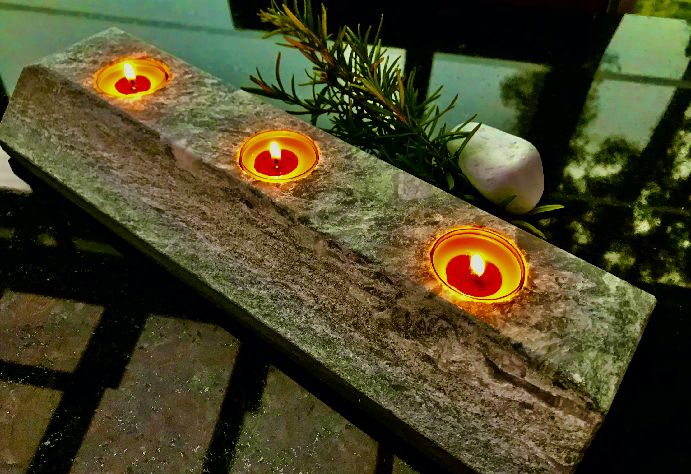 Kivialustan pituus on 35 cm. Kiven paksuus 5 cm. Painoa tälle ihanuudelle kertyy noin 5 kg, joten pysyy vakaasti paikoillaan. Kolme tuikkukynttilänaukkoa porattu kiveen. Kynttilänalustan pohjalle liimasimme huopatassut. Ja käsittelimme kiven suoja-aineella, jotta puhtaanapito on helppoa. Jokainen IkiOnnentuike on ainutlaatuinen, kahta samanlaista et löydä.