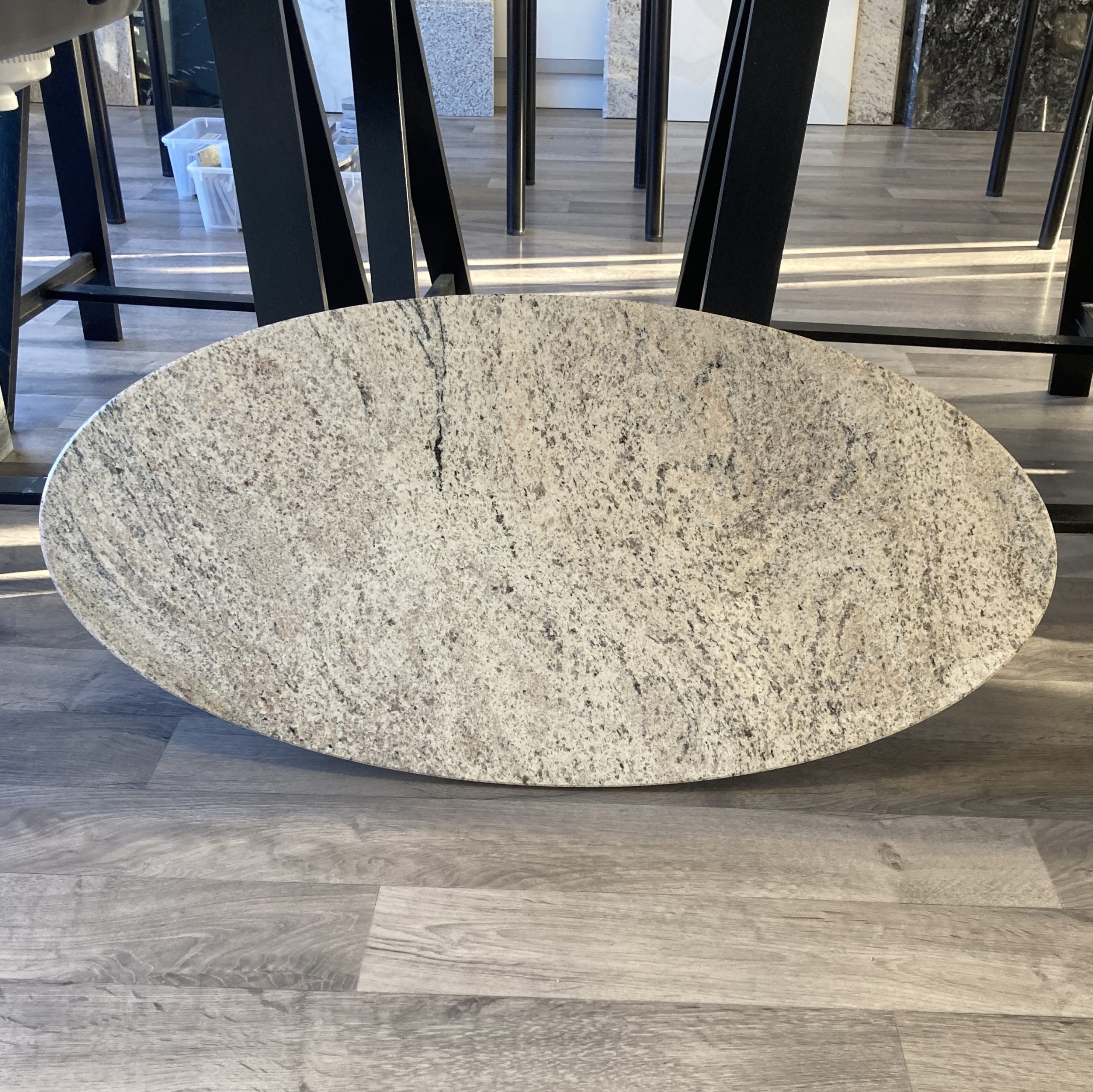 Pieni ovaali pöytätaso beigen ja harmaan sävyjä yhdistelevää Savanni-luonnonkiveä.