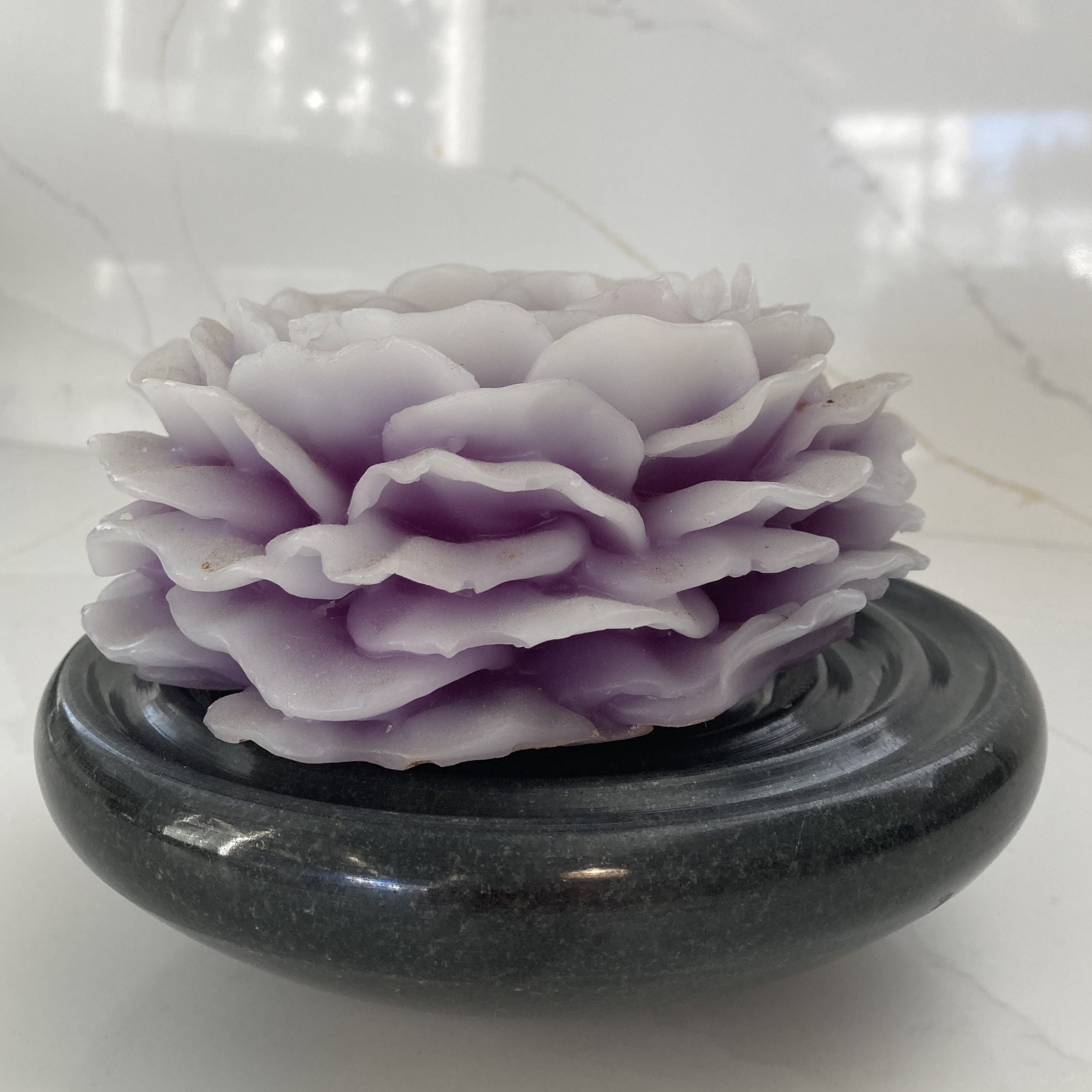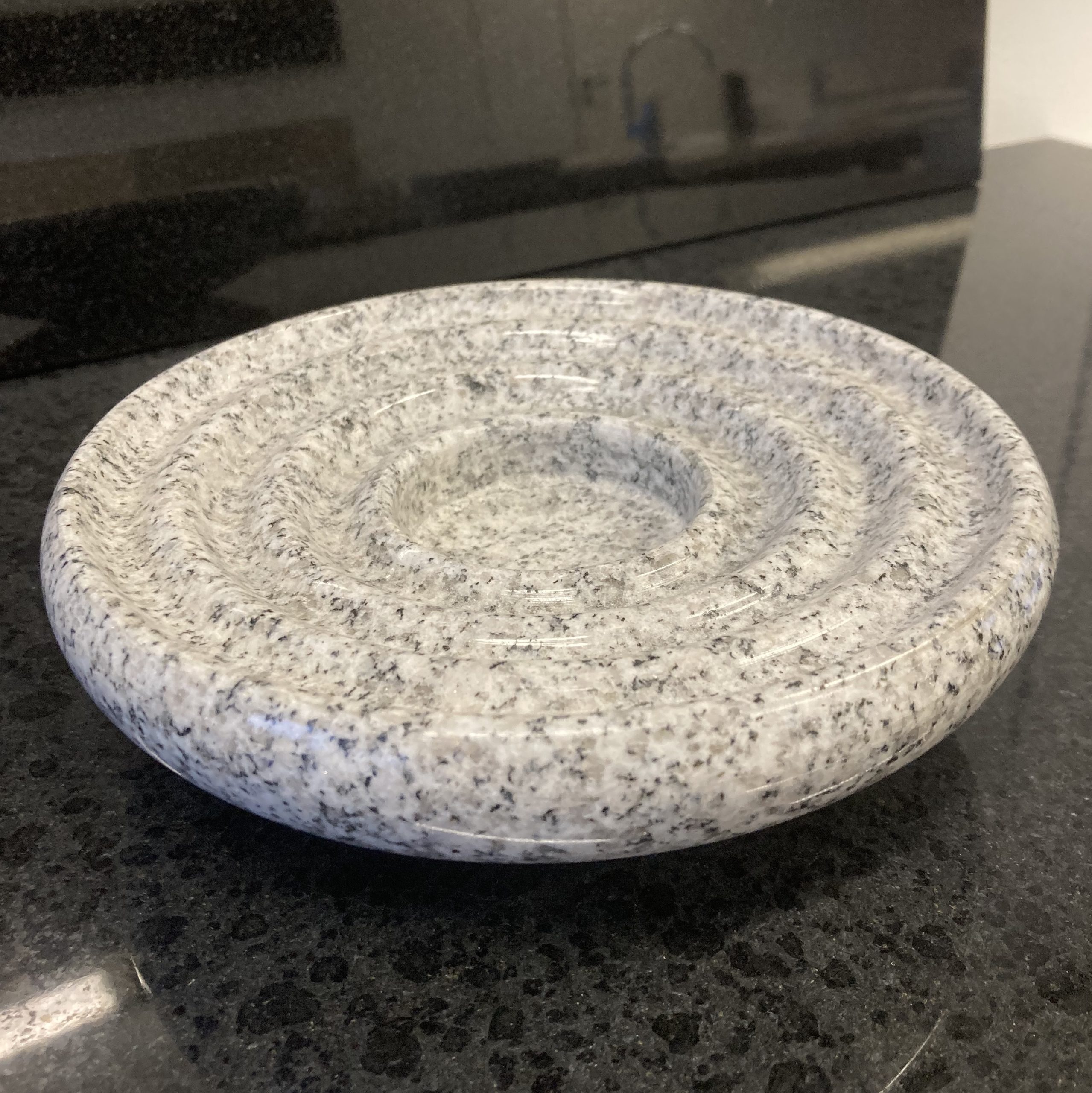 Pyöreä kynttilänalusta vaaleaa tai mustaa graniittia. Yläosassa neljä uurretta, jotka helpottavat kynttilän paikallapysymistä.