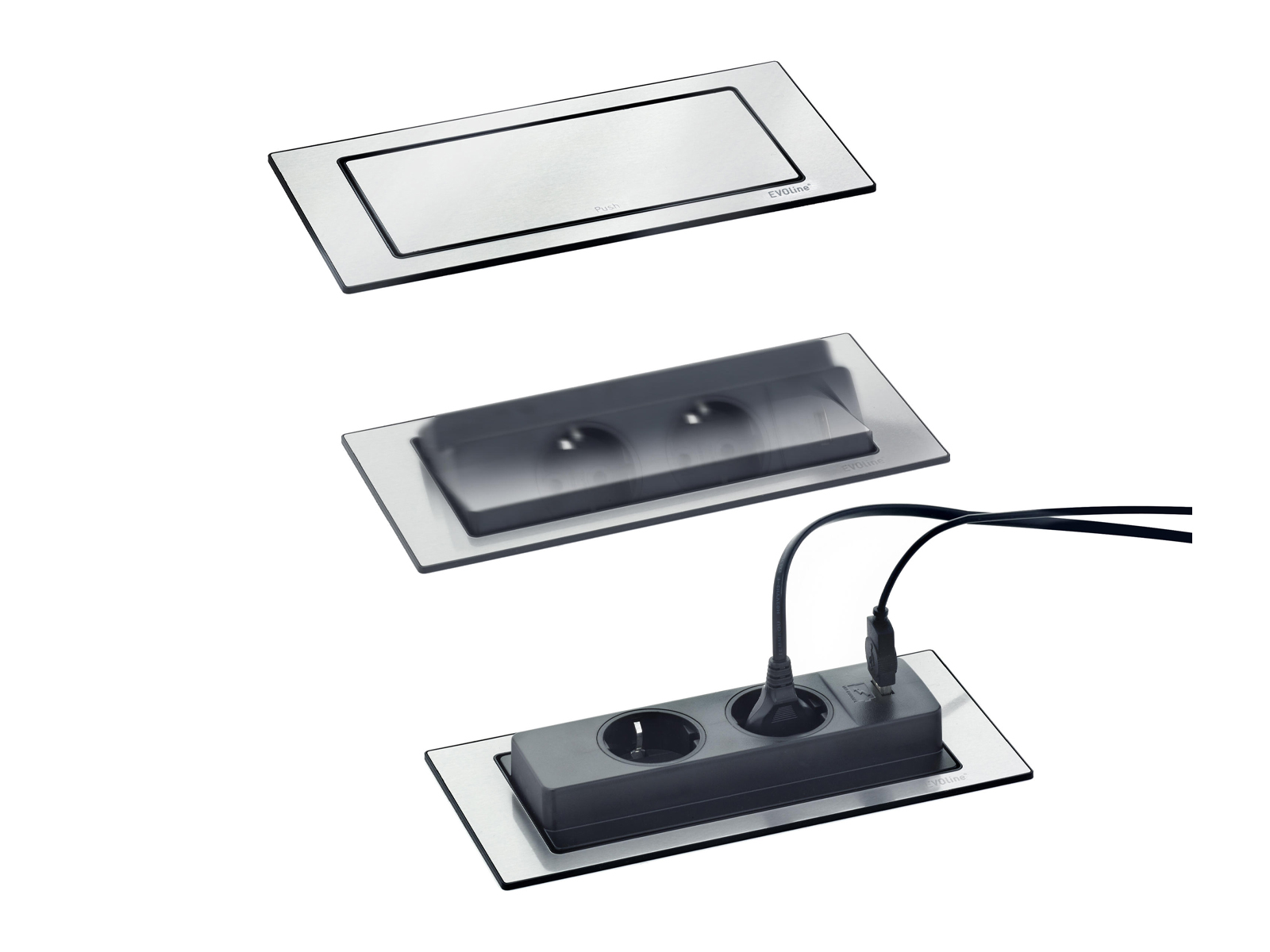 Tasoon asennettava Savo VOLTTI USB-C -pistorasia kääntyy kevyestä kosketuksesta ympäri käyttövalmiiksi.