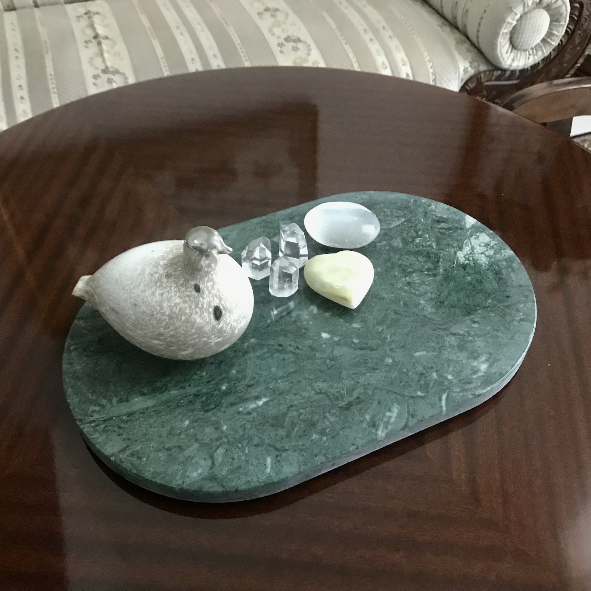 Marmorialusta Verde Guatemala sopii ruokien ja juomien tarjoiluun, koriste-esineiden alustana, kylpyhuoneessa kokoamaan yhteen kosmetiikkatuotteet tai mihin tahansa muuhun tarkoitukseen.