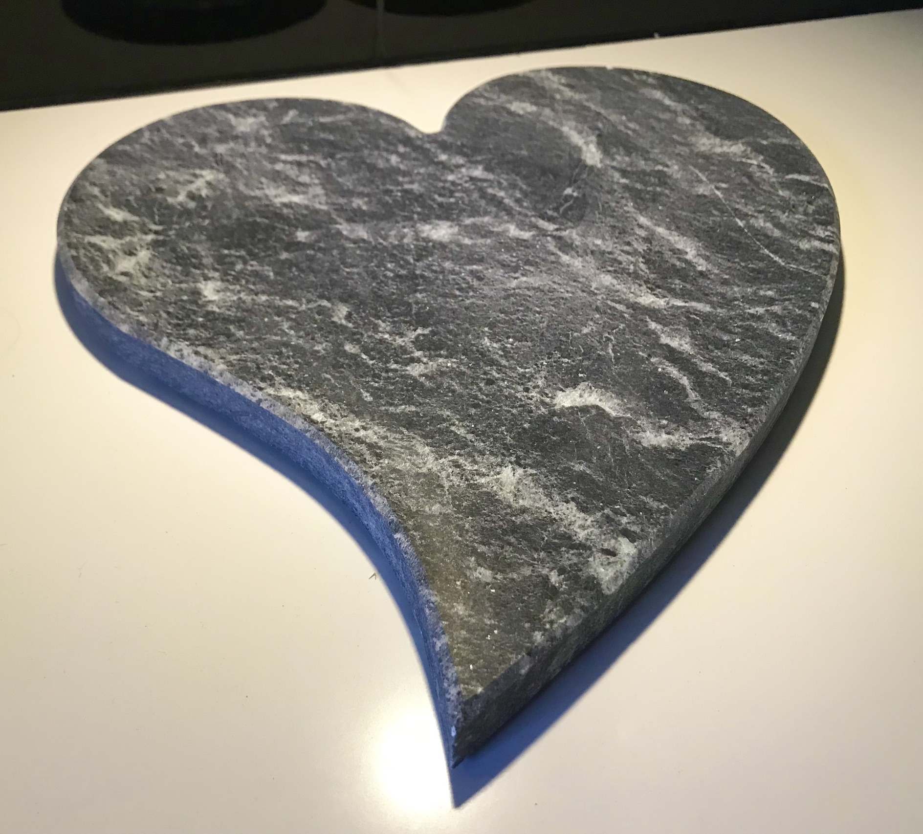 Jokainen vuolukivisydän on yksilönsä kuvioinniltaan ja väritykseltään. Jos käsittelet vuolukivisydämen esim. ruokaöljyllä, saat sydämen värin tummumaan, ja silloin siinä ei näy rasvatahrat. Valmistettu Suomen Juukasta louhitusta vuolukivestä ja työstetty HelaStonen omalla kivitehtaalla Hyvinkäällä.