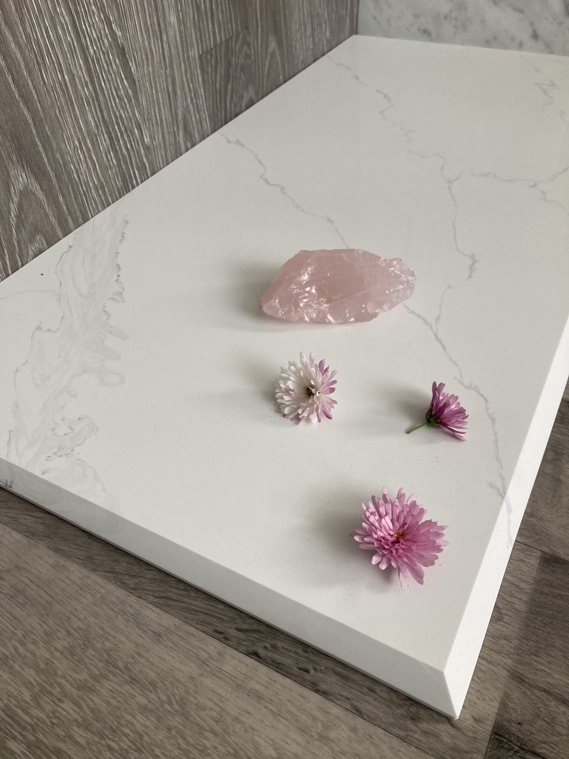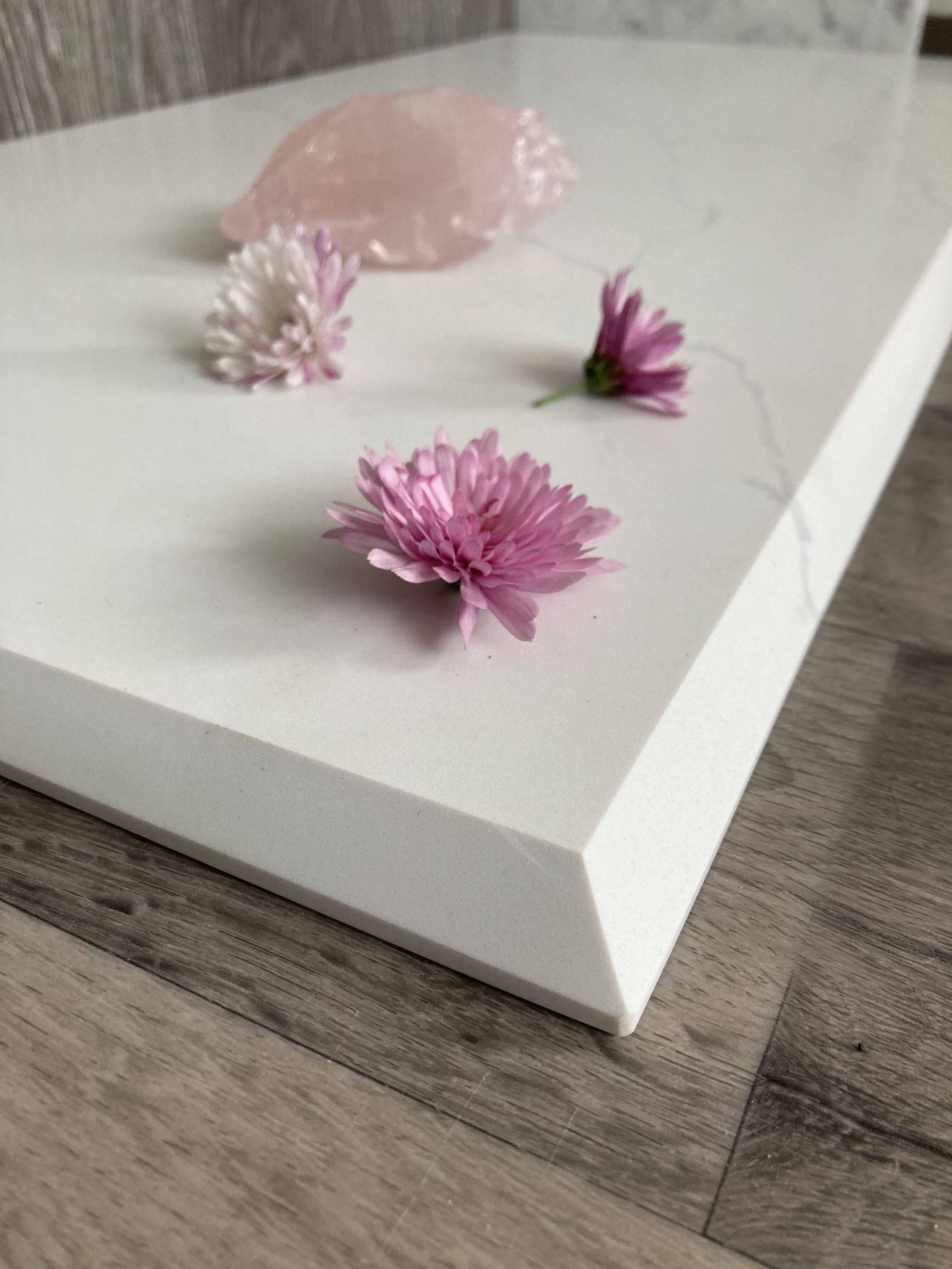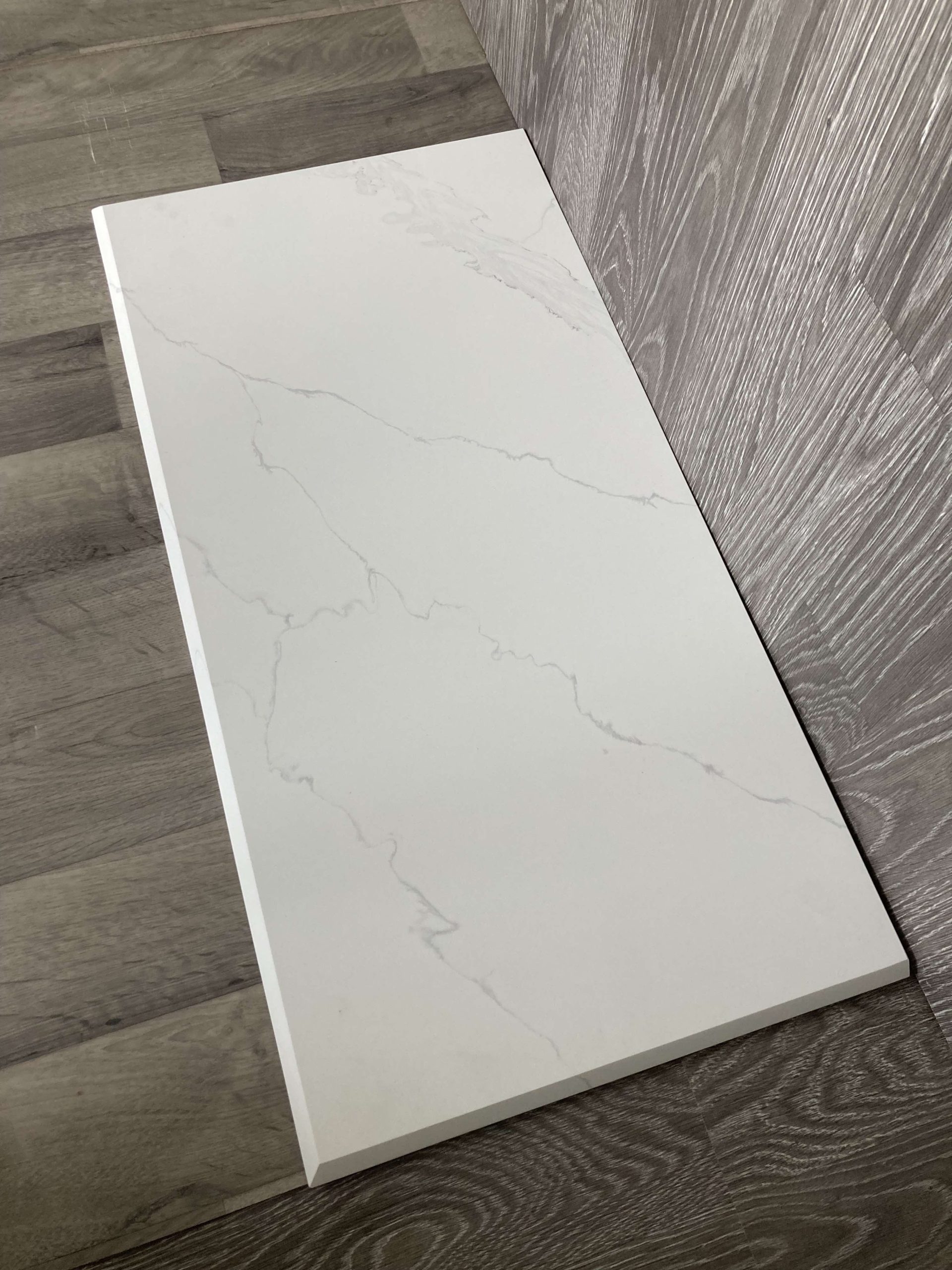 Valmistamme tulisijan eduskiviä 20 mm paksusta Carrara Vein -kvartsistamme. Huomaa kauniisti työstetty kaksiosainen viistereuna! Tämän eduskiven voit laittaa suoraan pakettilattian tai laminaatilattian päälle.